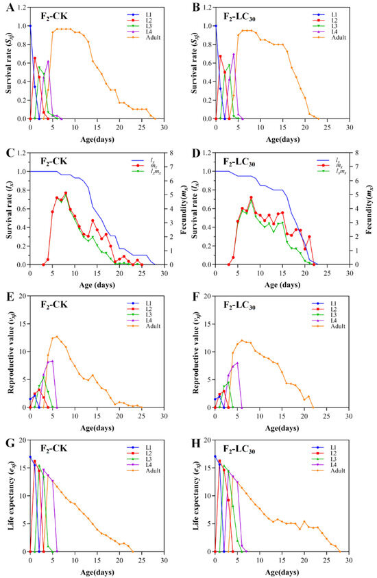 Age-stage specific survival rate (Sxj) (A,B), age-specific survival rate (lx), age-specific fecundity (mx), age-specific maternity (lxmx) (C,D), age-stage reproductive value (vxj) (E,F), and age-stage specific life expectancy (exj) (G,H) of F2 generation of A. gossypii treated with LC30 of lambda-cyhalothrin.