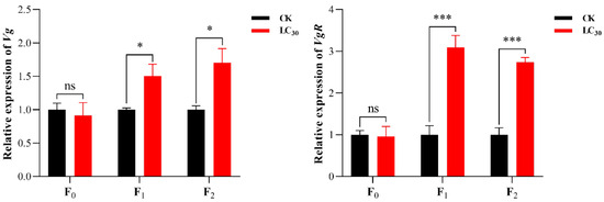 Relative expression level of Vg (A) and VgR (B) in F0–F2 generations of A. gossypii. The Student’s t-test is used for significance analysis (ns denotes insignificance, * denotes p-value less than 0.05, and *** denotes p-value less than 0.005). All error bars indicate ±SE.