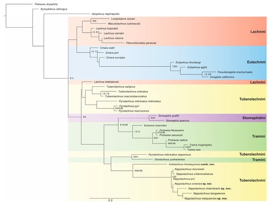 Maximum likelihood phylogenetic tree inferred from morphological dataset. Ultrafast bootstrap (UFB) and posterior probability (PP) support values are shown at the corresponding nodes in UFB/PP format. Tribes of Lachninae are highlighted in colour.