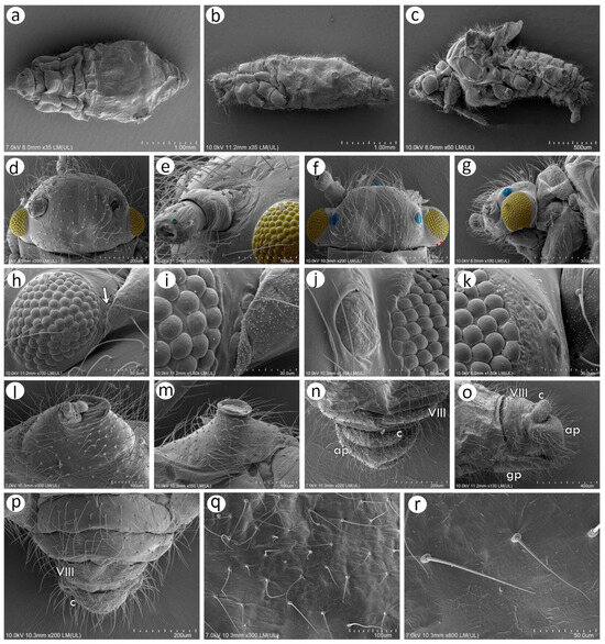 Scanning electron microscopy (SEM) of sexual morphs of N. piri: (a) dorsal side of the oviparous female, (b) lateral side of the oviparous female, (c) lateral side of the male, (d) dorsal side of the oviparous female head with compound eyes (yellow), (e) fragment of lateral side of the oviparous female head with compound eye (yellow) and visible campaniform sensillum on the dorso-lateral side of the antennal pedicel, (f) dorsal side of the head of the male with large compound eyes (yellow), three ocelli (blue), and triommatidia (red), (g) lateral side of the head of the male with large compound eye (yellow), ocellus (blue), and triommatidia (red), (h) compound eye of the oviparous female with hidden triommatidia (arrow), (i) ultrastructure of the compound eye ommatidia and triommatidia, (j) ultrastructure of the male compound eye ommatidia and ocellus, (k) ultrastructure of compound eye ommatidia and triommatidia, (l) siphunculus of oviparous female, (m) siphunculus of the male, (n) dorsal view of the perianal structures of oviparous female showing abdominal segment VIII (VIII), cauda (c), and anal plate (ap), (o) lateral side of the perianal area of oviparous female showing abdominal segment VIII (VIII), cauda (c), and anal plate (ap), (p) dorsal view of perianal area of the male with abdominal segment VIII (VIII) and cauda (c), (q) dorsal cuticle with numerous setae, (r) ultrastructure of the dorsal setae.