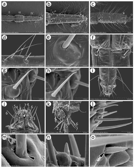 SEM of details of antennal sensilla of the alate male N. piri: (a) ultrastructure of the two rhinariola type B on the pedicel, (b) numerous small placoid sensilla and type I trichoid sensilla on ANT III, (c) ultrastructure of the trichoid sensillum socket and basal part with visible moulting pore (arrow), (d,e) size and shape of the small multiporous placoid sensilla dorsal view surrounded by sclerotic collar, (f) lateral side of the small multiporous placoid sensillum, (g) ultrastructure of the porous surface of the small multiporous placoid sensillum, (h) distal part of ANT V with large multiporous placoid sensillum, (i) ultrastructure of the porous surface of the large multiporous placoid sensillum, (j) small multiporous placoid sensillum (star) and type II sunken coeloconic sensillum (asterisk) on ANT VI surrounded by sclerotic reinforcements, (k) ultrastructure of small multiporous placoid sensillum on ANT VI, (l) ultrastructure of type II sunken coeloconic sensillum on ANT VI, (m) type II trichoid sensilla on the apical part of the terminal process, (n) ultrastructure of the type II trichoid sensillum, (o) ultrastructure of the apical parts of the type II trichoid sensilla.