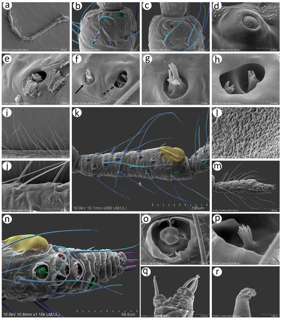 SEM of antennal sensilla of oviparous female N. piri: (a) antenna general view, (b) latero-ventral side of the pedicel showing type I trichoid sensilla (blue), campaniform sensillum (green), and single rhinariolum of type A (pink), (c) ventral side of pedicel showing type I trichoid sensilla (blue) and double rhinariolum of two types (pink), (d) ultrastructure of the campaniform sensillum, (e) ultrastructure of rhinariolum type A, (f) group of rhinariola type A (solid arrow) and double rhinariolum type B (dotted arrow), (g) ultrastructure of rhinariolum type A, (h) ultrastructure of the two rhinariola type B, (i) type I trichoid sensilla on antennal segments, (j) ultrastructure of sockets and basal parts of type I trichoid sensilla, (k) ANT V with type I trichoid sensilla (blue) and large multiporous placoid sensillum (yellow), (l) ultrastructure of the porous membrane of the large placoid sensillum on ANT V, (m) ANT VI with different kind of sensilla, (n) different types of sensilla on ANT VI: type I trichoid sensilla (blue), type II trichoid sensilla (violet), large multiporous placoid sensillum—major rhinarium (orange), accessory rhinaria in form of two small multiporous placoid sensilla (green), and four sunken coeloconic sensilla (pink), (o) ultrastructure of the small multiporous placoid sensillum, (p) ultrastructure of the type II sunken coeloconic sensillum, (q) type II trichoid sensilla on the apical part of the terminal process, (r) ultrastructure of the apex of the type II trichoid sensillum.