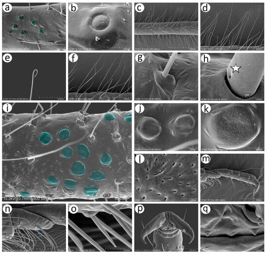 SEM of hind legs of oviparous female N. piri: (a) inner proximal part of hind femur with campaniform sensilla (green), (b) ultrastructure of the campaniform sensillum with visible pore near the middle of the main disc, (c,d) trichoid sensilla on hind femora, (e) ultrastructure of the trichoid sensillum apical part, (f) trichoid sensilla on hind tibiae (socket of the trichoid sensillum), (g,h) ultrastructure of the basal part of the sensillum with visible moulting pore (star), (i) fragment of hind tibia with numerous scent plaques (turquoise), (j,k) shape and porous surface of the protuberant scent plaques, (l) ultrastructure of the porous surface of the scent plaque, (m) hind tarsus, (n) first segment of hind tarsus chaetotaxy with one peg-like sensillum (blue), (o) ultrastructure of the peg-like sensillum, (p) claws of second segment of hind tarsus with residual parempodia (yellow), (q) residual parempodia.