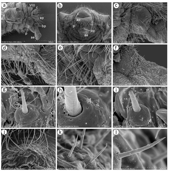 SEM of male genitalia of N. piri: (a) lateral side of the end of abdomen showing abdominal tergite VIII (VIII), cauda (c), anal plate (ap), parameres (p), basal part of the phallus (bp), and aedeagus (ae), (b) rear view of the abdomen showing abdominal tergite VIII (VIII), cauda (c), anal plate (ap), parameres (p), basal part of the phallus (bp), and aedeagus (ae), (c) parameres, (d) chaetotaxy of parameres in the lateral view, (e) chaetotaxy of parameres in the rear view, (f) lateral view of the basal part of the phallus and proximal part of aedeagus with numerous short sensilla chaetica, (g–i) ultrastructure of the sensilla chaetica, (j) sensilla chaetica on the basal part of the phallus from the rear view, (k,l) ultrastructure of sensilla chaetica on the rear of the basal part of the phallus.