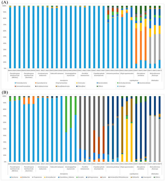 In our study, HTS revealed that the dominant bacterial phyla included Proteobacteria (mainly gamma proteobacteria), Spirochaetota, Cyanobacteria Firmicutes, Bacteroidota, Actinobacteriota, and Elusimicrobiota across all samples. Notably, Proteobacteria, Firmicutes, and Bacteroidetes are commonly found inside various insects and mammals [52]. Proteobacteria tend to dominate the microbiota of diverse invertebrates [53], including H. pensylvanicus and A. sanctaecruis [54], B. dorsalis [55], and H. hampei [47]. In our study, Hemipteran samples were conquered by Proteobacteria and Firmicutes, while Lepidopteran insects had three dominant bacterial phyla: Proteobacteria, Cyanobacteria, and Firmicutes. However, previous research has also found Proteobacteria and Firmicutes as dominant phyla in some Lepidopteran insects like Bombyx mori, Lymantria dispar, Manduca sexta, and Helicoverpa armigera [56]. Additionally, Firmicutes represent a major component of B. minax and Solenopsis invicta [57,58]. Moreover, Spirochaetota was found to be a major phylum in blattodean insects, consistent with previous studies [59]. Furthermore, Wolbachia exhibited varying levels of abundance, with the highest presence observed in P. bambusicola, showing significant differences among all samples.