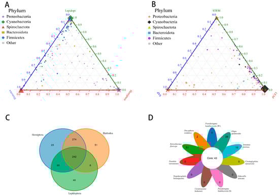 Plot showing the OTU distribution in ternary form. (A) Across three different insect orders. (B) Across three different diets. A single OTU is represented by each dot, and its size and location indicate how closely associated it is with certain insect groups and how abundant it is overall. (C) Venn diagram at OTU level across three different insect orders. (D) Flower plot between all groups. The top five enriched OTUs are represented by colored dots, while OTUs that are not significantly enriched in various insect orders are represented by gray dots.