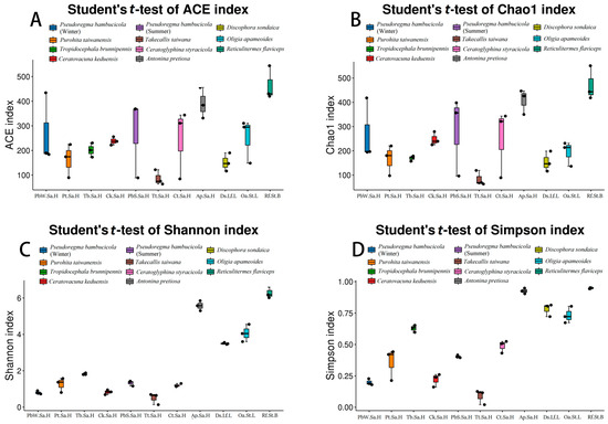 Comparison of the bacterial communities’ alpha diversity across all groups feeding on Bambusa, (A) ACE index, (B) Chao1 index, (C) Shannon index, and (D) Simpson index. Note: X-axis: Group name; Y-axis: Alpha diversity indices. The line inside the boxplots represents medians, the dots in the center are the means, and the whiskered bars are maximal and minimal values.