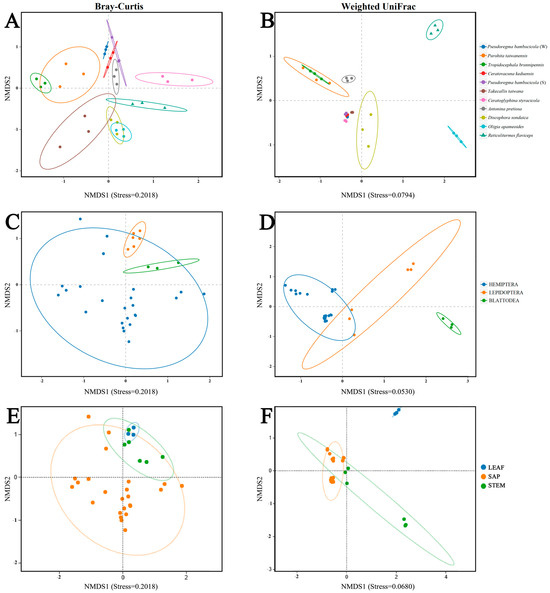 Beta diversity of the bacterial populations is displayed in NMDS plots of Bambusa feeding insects. Bray–Curtis distance: (A) all insect groups, (C) three different insect orders, (E) three different diet types and Weighted UniFrac distance (B) all insect groups, (D) three different insect orders, and (F) three different diet types. As shown in the legends, distinct groupings are represented by different colors.