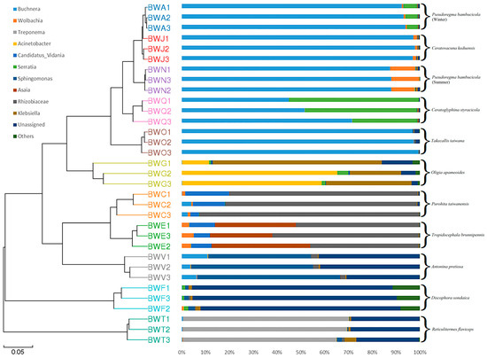 - Huang, K.; Wang, J.; Huang, J.; Zhang, S.; Vogler, A.P.; Liu, Q.; Li, Y.; Yang, M.; Li, Y.; Zhou, X. Host Phylogeny and Diet Shape Gut Microbial Communities Within Bamboo-Feeding Insects. Front. Microbiol. 2021, 12, 633075. [Google Scholar] [CrossRef]