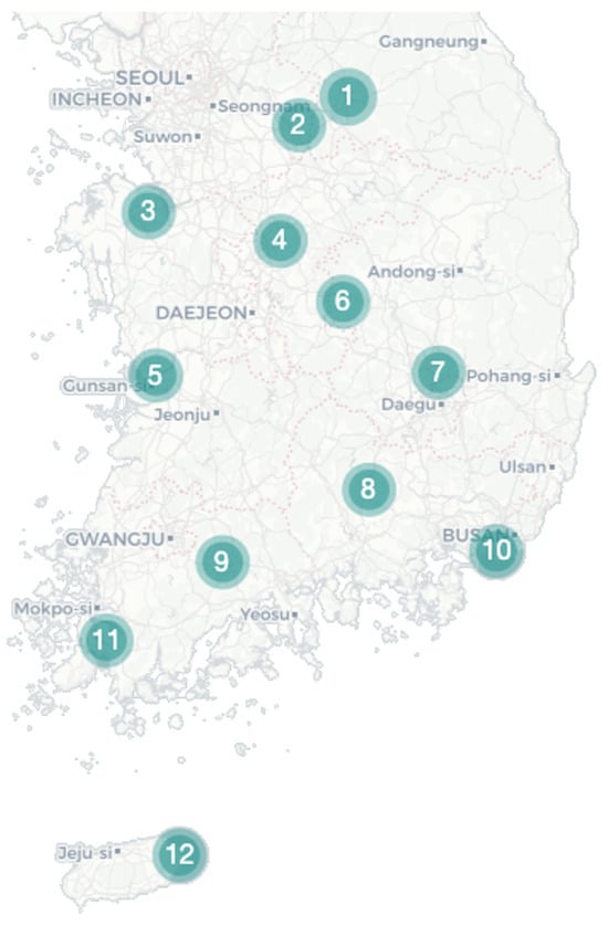 Collecting site. Mosquito samples were collected using Blacklight (BL) and Biogent (BG) traps from 12 rural areas in the Republic of Korea to establish the regional microbiome profile of Culex tritaeniorhynchus and Culex orientalis.