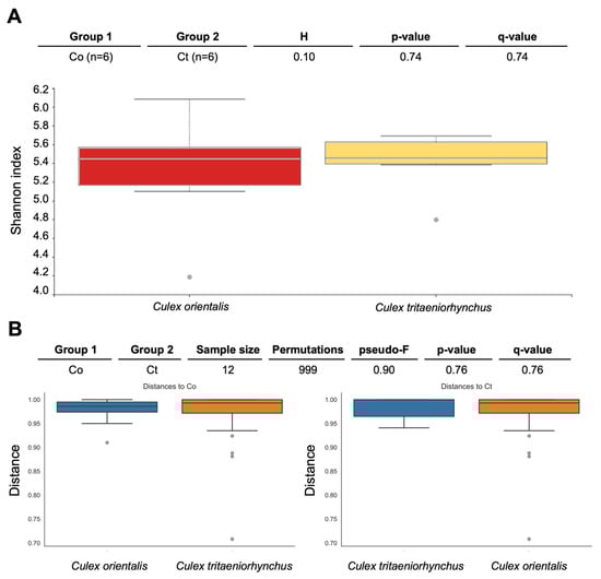 Pairwise diversity comparisons of the microbiome of Culex tritaeniorhynchus and Culex orientalis. Each box represents a distinct bacterial diversity metric for mosquito samples, which are grouped by mosquito species. The Shannon in each mosquito sample is depicted in panel (A), with no significant difference between groups (Kruskal-Wallis: H = 0.10, p = 0.74). (B) PERMANOVA (999 permutations) tests with Benjamini-Hochberg FDR correction were used to make these comparisons (q-value). Two species of mosquitoes collected at Sites 4, 5, 6, 9, 10, and 11 were used for analysis.