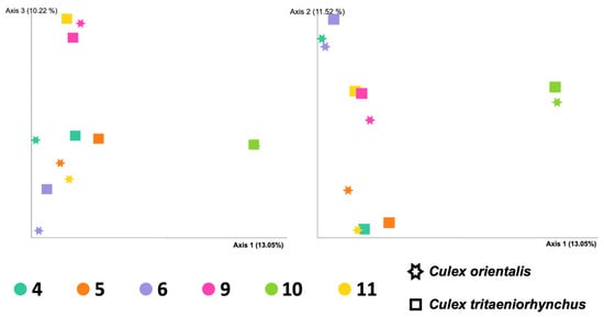 Site 9 showed the highest Shannon index for Cx. orientalis, indicating significant microbial diversity. A significant regional difference was observed in Cx. orientalis. In contrast, Culex tritaeniorhynchus exhibited the highest Shannon index at Site 6, but no significant difference was observed across sites. Alpha diversity group significance analysis revealed no significant difference between Cx. orientalis and Cx. tritaeniorhynchus (Figure 2A). Similarly, the PERMANOVA analysis for both species did not yield significant values (Figure 2B). The PCoA graph visually represented the distance between each sample based on microbiome composition and the ratio of all samples (Figure 3). Notably, clusters corresponding to sites were formed by Sites 5, 6, 9, and 10. Interestingly, mosquitoes of the two species at Sites 4 and 10 were considerably distant from mosquitoes in other sites.