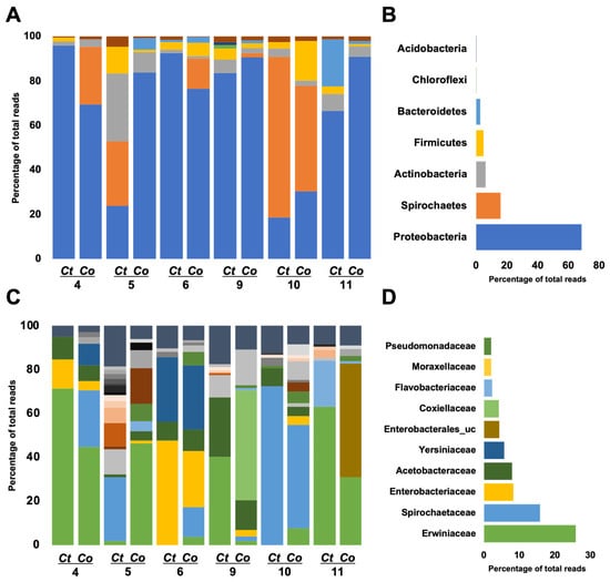 A total of 32 families were classified, with the top 10 families, based on the highest average ratio, collectively contributing to over 70% of the total abundance (Figure 4C,D and Figure 5A). The predominant family was Erwiniaceae, particularly dominant in Ct 4, 9, 11, and Co 4 and 5. Erwiniaceae was present in 10 samples but absent from Ct 10 and 6. Spirochaetaceae was the next most abundant family, prevalent in six samples, with the highest occurrence at Ct 10, Co 10, and dominance at Ct 5. Enterobacteriaceae and Yersiniaceae exhibited high detection rates in Ct 6 and Co 6, with Yersiniaceae additionally detected in Ct 6, Co 4, 5, and 6. Acetobacteraceae showed high prevalence in both Co and Ct at Site 9. Co 9 was uniquely dominated by Coxiellaceae, and Co 11 exhibited dominance by Enterobacterales_uc.