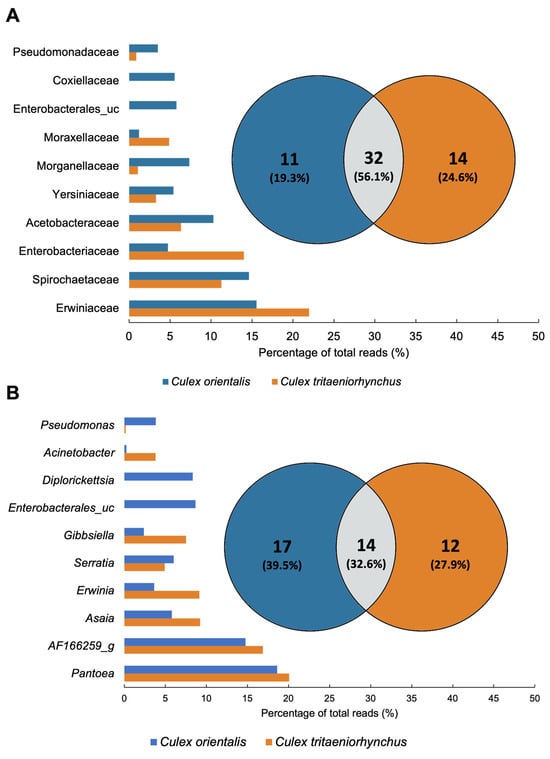 Comparison of Culex tritaeniorhynchus and Culex orientalis microbiome profile. Venn diagrams were prepared for the presence/absence data of mosquito samples at (A) Family and (B) Genus levels. The microbiome unique to samples or shared in common by distinct groups is shown by numbers. The proportion of total reads of the microbiome is represented by bar plots.