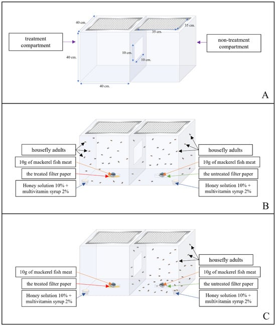 Repellency against housefly adults was evaluated by putting them into two test cages (size 40 × 40 × 40 cm): the first cage contained a tested formulation, but the second cage did not contain a tested formulation. The test cage was designed especially for repellency bioassay. It was made of five plastic sheets (40 × 40 cm) and one screen sheet (35 × 35 cm) at the top of the cage, as can be seen in Figure 1. The two cages were connected by a rectangular hole (10 × 10 cm). When the repellency bioassay was conducted, the cage with a tested formulation was opened to the cage with no tested formulation through the interconnecting passage. Two milliliters of tested formulations were dropped onto a filter paper (Whatman No.1®, Cytiva Global Life Sciences Solutions Operations UK Ltd., Buckinghamshire, UK, 8.5 cm in diameter) which was then put on a petri dish in the cage containing the treatment, while two milliliters of ethyl alcohol were dropped onto a filter paper which was then put on a petri dish in the cage containing no tested formulation. Ten grams of steamed mackerel fish meat were placed on top of both filter papers, as food, to attract the houseflies. A wet filter paper was placed in the petri dish in each cage and had a little ball of cotton wool placed adjacent to it that was soaked with honey solution 10% + multivitamin syrup 2.0% to provide the subjects with food and water. Twenty-five three-day-old housefly adults were released into each cage. The positive control, 12% (w/w) DEET, was tested concurrently with the tested formulations. Each treatment was performed in 5 replicates at the same time. The whole test is summarized in Figure 1 below.