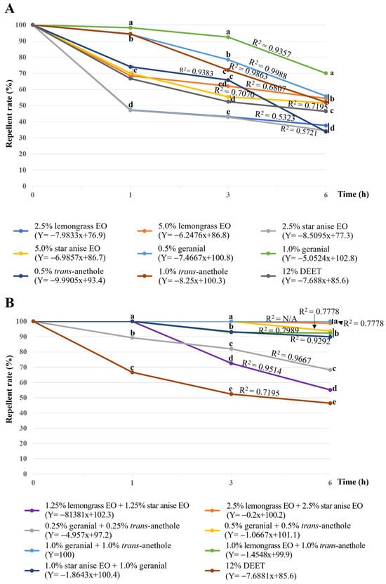 Repellent rate versus exposure time of formulations of lemongrass and star anise EOs and their main constituents: single-component formulations (A) and combinations (B). Note: Mean repellent rates within a row followed by the same letter do not differ significantly (Tukey’s post hoc test p < 0.05). N/A = not available.