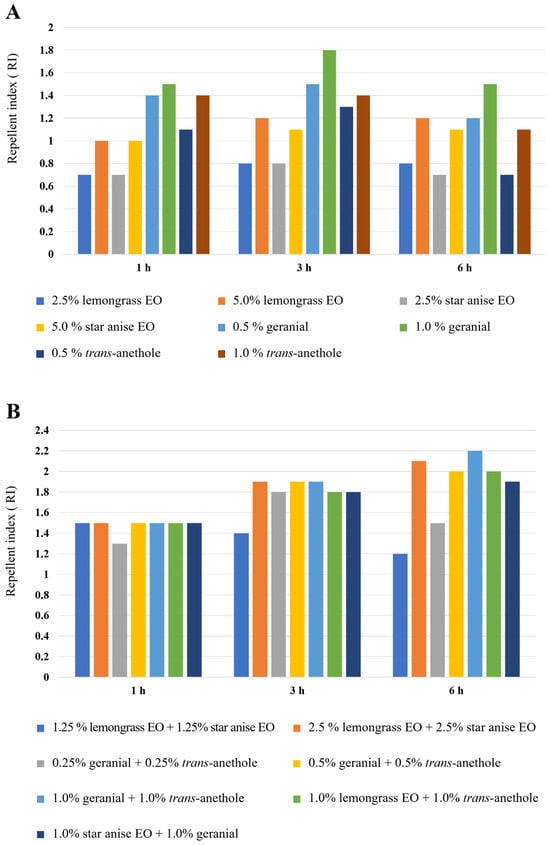 All combinations were 1.2 to 2.2 times (RI of 1.2–2.2) more highly repellent than 12% w/w DEET. Among the seven combinations, four formulations—2.5% lemongrass EO + 2.5% star anise EO, 0.5% geranial + 0.5% trans-anethole, 1.0% geranial + 1.0% trans-anethole, and 1.0% lemongrass EO + 1.0% trans-anethole—exhibited the strongest repellency, with 92.3 to 100% repellent rates at 6 h exposure. These four formulations were 2.0 to 2.2 times (RI of 2.0–2.2) more repellent than 12% w/w DEET. In particular, the combination of 1.0% geranial + 1.0% trans-anethole exhibited the greatest repellency, with a 100% repellent rate at 6 h of exposure time, which was 2.2 times (RI of 2.2) higher repellency than 12% w/w DEET.