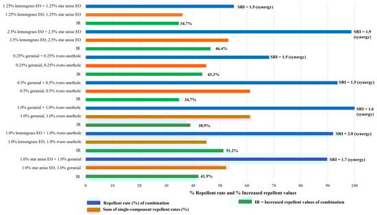 The synergistic repellent index (SRI) and increased repellent value (IR) of the seven combinations (when compared with the single-component formulations) are shown in Figure 4. All combinations showed a highly synergistic effect with an SRI of 1.5 to 2.0. The greatest synergistic effect was achieved by the combination of 1.0% lemongrass EO + 1.0% trans-anethole, with an SRI of 2.0 and an IR of 51.2.