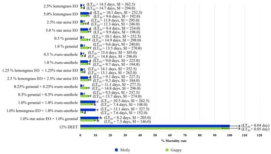 Mortality rates ±SE of single-component formulations and combinations against molly and guppy at 10 days post-treatment. Note: Mean mortality rates ±SE within a row followed by the same letter do not differ significantly (Tukey’s post hoc test p < 0.05); LT50 = 50% Lethal Time; Safety index (SI): SI > 1 signifies that the formulation was safer than DEET for the non-target species, and SI < 1 signifies that the formulation was less safe than DEET for the non-target species.