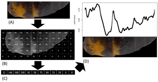 21]. One image was omitted from the analysis because the reflections on the abdomen saturated camera’s sensor. We extracted pixel values for red, green, and blue channels and averaged all three channels to generate a gray-scale image. We normalized pixel values in the range 0–1. Saturated values (values above 0.95) and desaturated values (values that equal 0) were removed. Parts of abdomens with yellow marks had higher pixel values than darker parts of abdomens. Each image was collapsed into a vector of values by calculating median value of each image’s column of pixels as shown in