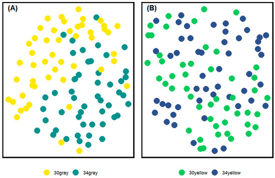 UMAP was run separately for each colony origin (yellow and gray). Stratification of data was observed between the 30 °C and 34 °C treatments within the gray group (