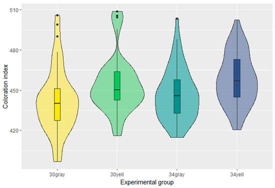 The coloration index was conceived as a simple single-value metric for coloration. In the 30gray group, the mean was 441.9 ± 3.4 and 454.0 ± 3.0 in the 30yell group (