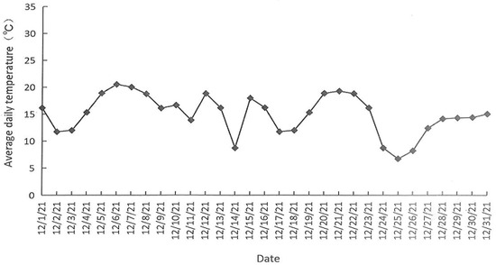 Figure 1 shows that the daily average temperature in the greenhouse during December 2021 was about 15.0 °C (calculated according to daily average temperature), where the highest daily average temperature was 20.5 °C and the lowest daily average temperature was 6.7 °C.