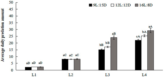 Figure 2 shows that the daily predation amounts by first- and second-instar larvae did not differ among photoperiods. By contrast, the daily predation amounts by third- and fourth-instar larvae increased as the illumination time increased. The average daily predation amount by third-instar larvae was 24.0 under the long photoperiod, which differed from those under the short photoperiod (15.1) (F = 47.622, df = 2, 2, p < 0.001) and medium photoperiod (17.2) (F = 47.622, df = 2, 2, p < 0.001), while the average daily predation amount under 9L:15D did not differ from that under 12L:12D (F = 47.622, df = 2, 2, p = 0.074). The average daily predation amount by fourth-instar larvae was 29.2 under the long photoperiod, which differed from those under the short photoperiod (22.0) (F = 57.672, df = 2, 2, p < 0.001) and medium photoperiod (25.4) (F = 57.672, df = 2, 2, p = 0.001), and the daily predation amount by fourth-instar larvae also differed significantly between short and medium photoperiods (F = 57.672, df = 2, 2, p = 0.003). And there is a significant interaction between photoperiod and developmental stages (F = 13.715, df = 11, 24, p < 0.001).