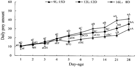 Figure 3 shows that photoperiod also affected the daily predation amount by H. axyridis adults. The daily predation amounts by adults from the first day to the fourth day after eclosion did not differ between photoperiods. However, the predation amount by adults tended to increase as the illumination time increased from the fifth day after eclosion, and the daily predation amounts at the fifth day after eclosion differed between the long photoperiod and the short photoperiod (F = 26.446, df = 2, 2, p = 0.001) and also differed between the medium photoperiod and the short photoperiod (F = 26.446, df = 2, 2, p = 0.001) but not differ between the medium photoperiod and the long photoperiod (F = 26.446, df = 2, 2, p = 0.436). The daily predation amounts by adults differed between the three photoperiods from the sixth day after eclosion (6-day-old adults: long photoperiod–medium photoperiod: F = 92.453, df = 2, 2, p = 0.016; long photoperiod–short photoperiod: F = 92.453, df = 2, 2, p < 0.001; medium photoperiod–short photoperiod: F = 92.453, df = 2, 2, p < 0.001; 7-day-old adults: long photoperiod–medium photoperiod: F = 76.436, df = 2, 2, p = 0.002; long photoperiod–short photoperiod: F = 76.436, df = 2, 2, p < 0.001; medium photoperiod–short photoperiod: F = 76.436, df = 2, 2, p < 0.001; 14-day-old adults: long photoperiod–medium photoperiod: F = 26.717, df = 2, 2, p = 0.014; long photoperiod–short photoperiod: F = 26.717, df = 2, 2, p < 0.001; medium photoperiod–short photoperiod: F = 26.717, df = 2, 2, p = 0.008; 21-day-old adults: long photoperiod–medium photoperiod: F = 36.404, df = 2, 2, p = 0.003; long photoperiod–short photoperiod: F = 36.404, df = 2, 2, p < 0.001; medium photoperiod–short photoperiod: F = 36.404, df = 2, 2, p = 0.010; 28-day-old adults: long photoperiod–medium photoperiod: F = 24.162, df = 2, 2, p = 0.013; long photoperiod–short photoperiod: F = 24.162, df = 2, 2, p < 0.001; medium photoperiod–short photoperiod: F = 24.162, df = 2, 2, p = 0.013). It also can be seen from Figure 3 that the predation amount by H. axyridis increased significantly with aging of the adults under each photoperiod (long photoperiod: F = 214.546, df = 9, 20, p < 0.001; medium photoperiod: F = 62.510, df = 9, 20, p < 0.001; short photoperiod: F = 66.877, df = 9, 20, p < 0.001). And there is a significant interaction between photoperiod and instar (F = 13.459, df = 29, 60, p < 0.001).