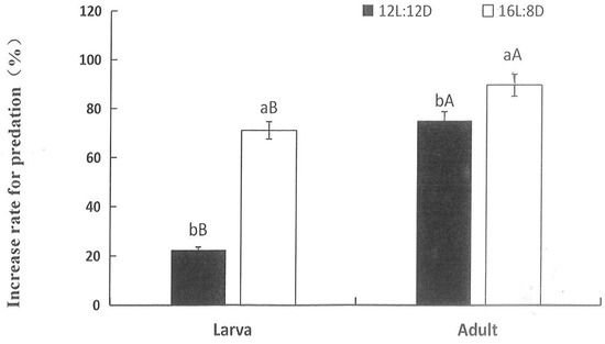 The increase rate for predation of fourth-instar larvae and 5-day-old adults of H. axyridis to M. persicae under different photoperiods. Different lowercase letters indicate a significant difference between the increase rate for predation of 5-day-old adults or 4th-instar larvae under medium photoperiod and long photoperiod according to two-factor analysis, LSD, at p < 0.05 using SPSS 27.0. Different uppercase letters on the columns indicate a significant difference between the increase rate for predation of 4th-instar larvae and 5-day-old adults under the same photoperiod according to two-factor analysis, LSD, at p < 0.05 using SPSS 27.0.