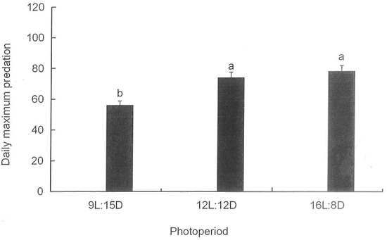 Maximum daily predation amounts by adult H. axyridis to M. persicae under different photoperiods. The maximum daily predation amount is the maximum theoretical predation amount of a ladybug in a day, which is equal to the time unit 1 (day) divided by the time (day) needed by a ladybug to handle one aphid. Different lowercase letters on columns indicate a significant difference between the daily maximum predation amounts under different photoperiods according to LSD at p < 0.05 by one-way ANOVA using SPSS 27.0.
