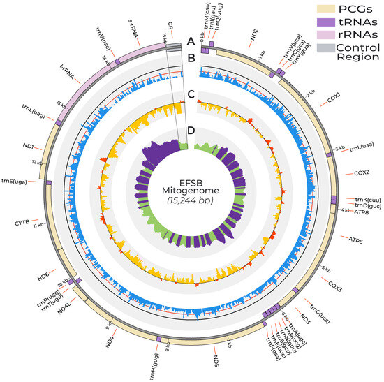 Circos plot detailing the assembled EFSB mitogenome and various statistics. (A) Gene organization of the EFSB mitogenome. Yellow, purple, pink, and grey boxes indicate protein-coding genes, tRNA genes, rRNA genes, and the control region, respectively. Boxes oriented inward are genes transcribed in the majority strand, while the boxes oriented outward are genes transcribed in the minority strand. (B) The GC content histogram was calculated in 20 bp sliding windows. Black and red lines correspond to 50% and 25% GC content, respectively. (C) GC-skew was calculated using a window size of 100 bp and a step size of 20 bp. Black line corresponds to 0 GC-skew value and histogram bins colored yellow and red have negative and positive GC skew values, respectively. (D) Coverage distribution across all positions. The EFSB mitogenome has a mean coverage of 9571×. Positions having coverage values above and below the mean coverage value are colored purple and green, respectively. The highlighted sector in dotted lines indicates the control region of the EFSB mitogenome characterized by low GC content and a switch in the sign of the GC skew values.