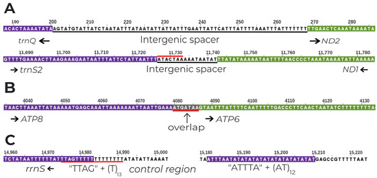 The mitochondrion is a fundamental, energy-generating organelle responsible for oxidative phosphorylation [1,2]. Mitochondria are believed to have originated from the endosymbiosis of an ancestral Archaeal prokaryote with an alphaproteobacterium [3]. The energy-generating capacity of the mitochondria is fundamental to life that almost all extant eukaryotes contain fully functional or derivative forms of mitochondria [4], with the only exception to date being the flagellated excavates, Monocercomonoides [5]. Although most of the mitochondrial proteins are encoded by the nuclear genome, most mitochondria preserve a highly reduced genome encoding 13 protein-coding genes important for the electron transport chain and respiratory function. Mitochondrial genomes also contain a self-sufficient translation machinery consisting of a complete set of 22 tRNAs and 2 rRNAs [6]. Some mitochondrial genes (e.g., cytochrome oxidase I (COI) subunit) are already widely established for use in phylogenetics [7]. Animal mitogenomes have conserved gene content and maternal inheritance, properties that enable extensive use not only in phylogenetics but also in population genetics [8], diagnostics and species delineation [9], and molecular evolution [10,11]. Moreover, the use of multi-gene datasets in phylogenetics has additional advantages such as reducing sampling error, making it the modern standard in inferring species relationships between organisms [12,13].