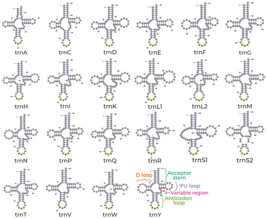 - Chan, P.P.; Lin, B.Y.; Mak, A.J.; Lowe, T.M. tRNAscan-SE 2.0: Improved Detection and Functional Classification of Transfer RNA Genes. Nucleic Acids Res. 2021, 49, 9077–9096. [Google Scholar] [CrossRef]