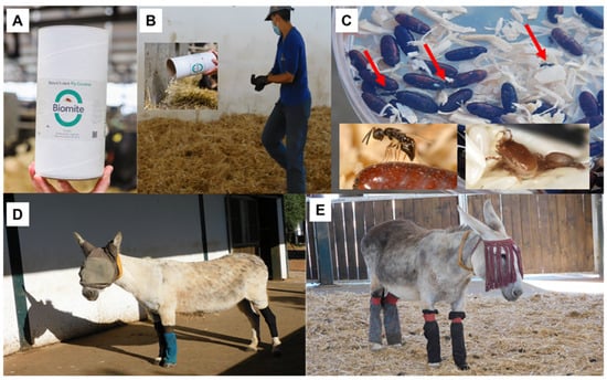 Summary of some management actions conducted in The Donkey Sanctuary (Western Spain). (A,B) Biological control agents used in this IPM strategy and hand release on the bedding of the barns (C). Examples of some specimens of Spalangia cameroni emerged from pupae in the laboratory (red arrows) and detailed pictures of Spalangia cameroni and predatory acari Macrocheles robustulus. (D,E) Examples of some donkeys using face masks and mesh leggings as protective measures against Stomoxys bites.