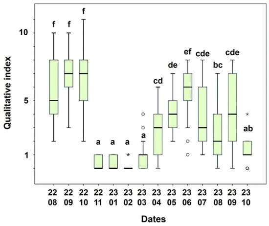 Box-plot graph showing the qualitative index (sum of the five defensive behaviors) from video recordings on equids over time conducted in The Donkey Sanctuary (Western Spain). Different superscripts for each date indicate significant differences according to Duncan’s post hoc test (p ≤ 0.05). The circles indicate extreme values and the * indicate outlier values.