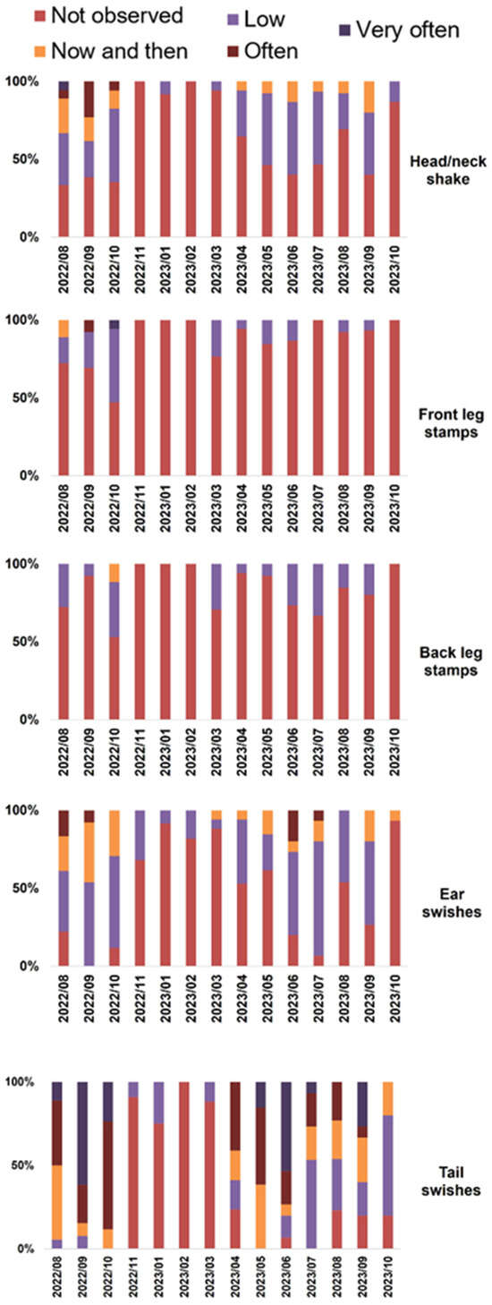 Significant differences in four defensive movement scores compared to the year-earlier period were found: Ear swishes (p < 0.01), head/neck shake (p < 0.01), front leg stamp (p = 0.228), back leg stamp (p = 0.007) and tail swishes (p < 0.01) (Figure 5) and all of them remained high in summer–autumn months. Tail swishes were the defensive action with the highest frequency.