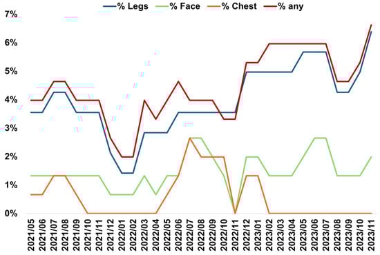 Indicator of lesions in donkeys (n = 14) caused by S. calcitrans bites according to the an-atomical part over time in the Donkey Sanctuary (Western Spain). Percentage is calculated as the number of animals affected divided into the total for the period May 2021 to November 2023.
