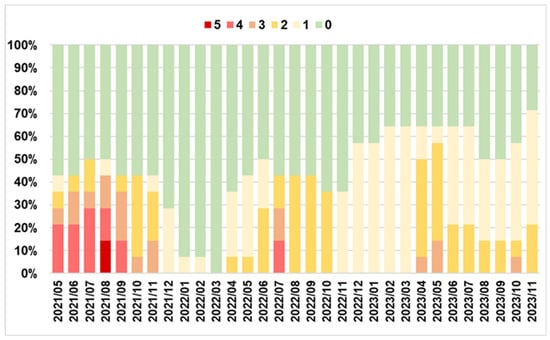 The legs were the anatomical part with the highest incidence of lesions. Summer months (July–September) showed the highest incidence of lesions, and winter months the lowest (January and February) (Figure 6, Table S6). The chest (p = 0.030) was the only anatomical area with significant differences by date. Significant differences were observed between date and degree of severity (p < 0.001), being the months between May and September 2021 together with September 2022, the dates that have reached the maximum grade 5. The date with the most severe lesions (grade 5) was August 2021 (Figure 7). Afterward, there is a clear declining trend in the degree of severity with respect to time, with severity increasing from grade 2 to 3 always during the month of April and remaining at those levels until October-November each year (Figure 7).