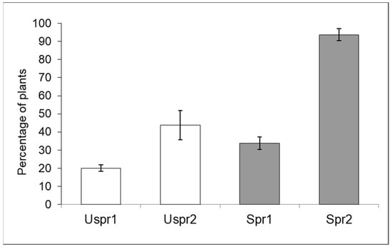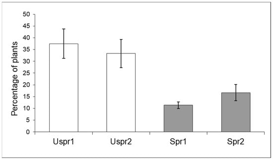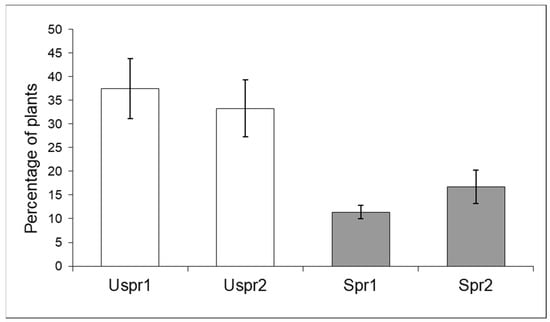 Aphid-infested maize plants (number of inspected plants/sample = 160) in sprayed (Spr) and control/unsprayed (Uspr) fields in 2008 (% ±S.E.). Study Area is indicated by 1 or 2.
