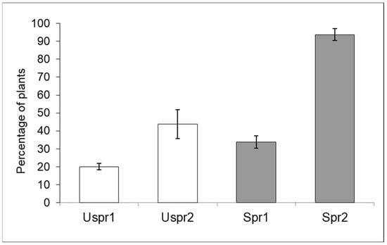 In summary, aphid colony density in unsprayed samples was significantly lower than in samples from sprayed fields and both Study Areas showed such a trend. Aphid density in Study Area 2 was significantly higher than in Study Area 1; this trend affected both Spr and Uspr samples. Regarding the natural enemies of aphids (Figure 2), the proportion of maize plants infested by aphids that host predators in the Uspr samples was significantly higher than that recorded in the Spr fields (contingency table), in both Study Area 1 (p < 0.01) and in Study Area 2 (p < 0.05). It should be noted that the natural enemy samples of Uspr1, Uspr2 and Spr1 were dominated by ladybirds (>50%), whereas the natural enemy community in Spr2 was dominated by hoverflies (97%).