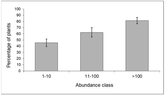 The predator community included ladybirds, hoverflies, lacewings (Chrysoperla sp.), bugs (Orius sp., Nabis sp.), earwigs (Forficula sp.), and beetles (Staphylinidae). The proportion of maize plants colonized by predators tended to increase with increasing aphid infestation according to a density-dependent pattern (contingency table—p < 0.01) (Figure 5).