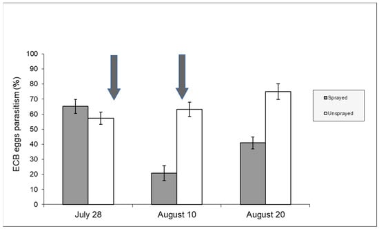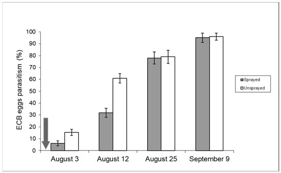 The typical development of second-generation ECB egg parasitism by T. brassicae is shown in Figure 6 (unsprayed sample): the parasitism rate was moderate at the beginning of oviposition by second-flight ECB females, but it tends to increase exponentially in August and usually peaks between the end of August and the first ten days of September, when parasitism rates can exceed 90% [19].