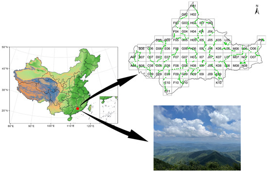 The Chebaling National Nature Reserve (Figure 1) is located southeast of Shaoguan City, Guangdong Province, China (114°09′04″–114°16′46″ E, 24°40′29″–24°46′21″ N), representing a typical transitional zone from a southern subtropical to central subtropical area and covering a total area of 75.45 km2 with elevations ranging from 330 to 1256 m above sea level. This reserve is covered by subtropical evergreen broadleaf forests with its climate regime having a subtropical monsoon climate. The annual average temperature and precipitation are approximately 19.6 °C and 2126 mm, respectively. Additionally, the landform of this area is characterized by mountains that are typical of the South China fold system and exhibit a complex topography.