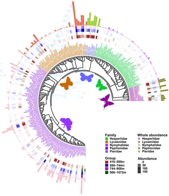 Illustration of mapping and visualizing associated data on phylogeny, species abundance distributions were aligned to the tree. The placement tree from maximum likelihood (ML) analysis was constructed according to the constraint method and visualized using ggtree and ggtreeExtra. Different families are labeled with different colors. The heatmap (inner rings) indicates the relative abundance of each species in different elevational gradients; the histogram (outer ring) in the outer layer depicts the relative abundance of each species.