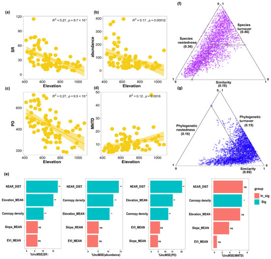 Variations in (a) species richness (SR), (b) abundance, (c) Faith’s phylogenetic diversity (PD), and (d) mean nearest taxon distance (MNTD) of butterflies along elevation in Chebaling; regression lines refer to the significant relationship between the two variables detected through linear models and shading areas associated with the lines represent the 95% confidence interval; (e) the importance of the five environmental factors (analyzed using a random forest model) in driving SR, abundance, PD, and MNTD, significance levels: *: p < 0.05, **: p < 0.01, and ns: p > 0.05; decomposition analysis of (f) taxonomic beta diversity, and (g) phylogenetic beta diversity.