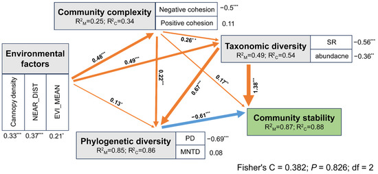 The direct and indirect effects of environmental factors, community complexity, taxonomic diversity, and phylogenetic diversity on the responses of community stability using piecewise SEM. The environmental factors, community complexity, taxonomic diversity, and phylogenetic diversity were changed to composite variables. Numbers adjacent to measured variables are their coefficients with composite variables. Numbers adjacent to arrows are path coefficients are the directly standardized effect size of the relationship. The thickness of the arrow represents the strength of the relationship. The conditional (C) and marginal (M) R2 represent the proportion of variance explained by all predictors without and with accounting for random effects of ‘sampling site’. Significance levels of each predictor are * p < 0.05, ** p < 0.01, *** p < 0.001.
