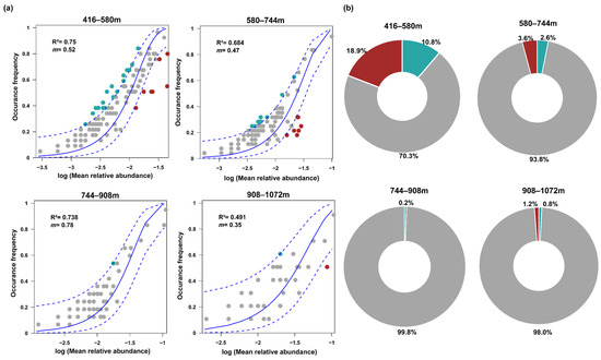 (a) The effects of random dispersal and ecological drift on the assembly of butterfly communities at different elevations through neutral model analysis. R2 indicates the goodness of fit to the neutral model. m indicates the estimated migration rate. The solid blue lines indicate the best fit to the neutral model and dashed blue lines represent 95% confidence intervals around the model prediction. (b) The relative abundance of the over-represented (light blue), neutrally distributed (grey) and under-represented species (red) in the butterfly communities.