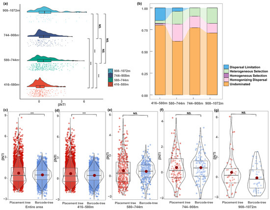 (a) The significance of the difference in the values of beta nearest taxon index (βNTI) across different elevational gradients (416–580 m, 580–744 m, 744–908 m, and 908–1072 m) tested by Kruskal–Wallis; (b) the relative contribution of each ecological process to butterfly community assembly; the significance of the difference between the values of β-NTI obtained from placement tree and barcode tree tested by Wilcox in the (c) entire area, at (d) 416–580 m, (e) 580–744 m, (f) 744–908 m, and (g) 908–1072 m communities; significance levels: ***: p < 0.001 and NS.: p > 0.05.