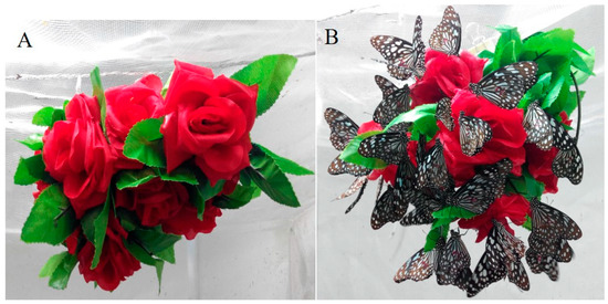 Tirumala limniace (the blue tiger, Lepidoptera: Danaidae), as a flower-visiting and highly charismatic butterfly, is utilized in butterfly gardens in China. The pupal stage of T. limniace lasts approximately 10 days, and the adult stage lasts approximately 15 days. Adults start to visit flowers on the second day after eclosion, and courtship and mating take place on the sixth day, while oviposition occurs the following day [18]. During foraging, T. limniace had some response to visual cues but gave more weight to olfactory cues [19].